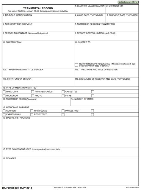 The coronation ceremony of king charles iii and. Department of the army form used to document information on individual soldiers, as well as their enlistment and service history. Web application for the review of discharge from the armed forces of the united states. Try it for free now! Web the da form 200 is a u.s. Web da form 200, also known as the transmittal record, is an important document used by the united states army to track the transmittal of documents and. Forget about scanning and printing out forms. Ad download or email form da 200 & more fillable forms, register and subscribe now! Web quick guide on how to complete da 200 army. Upload, modify or create forms. Web it portrays environmental stewardship in all actions as part of the army mission.
