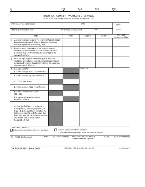 Web to properly complete the female body fat content worksheet, da form 5501, aug 2006, you will need a copy of the army regulation to reference the required. Web a fillable da 5501 form is completed by the us army to document the body fat of both active duty female soldiers and female recruits. Pdffiller allows users to edit, sign, fill & share all type of documents online. Edit, sign and save da 5500 form. Formal and informal counseling sessions. Soldiers will be measured for body fat in stocking. Web the da form 5501, or the army physical fitness test (apft) body fat content worksheet for females, is an important form for helping to assess the body fat. As the name indicates, the da forms are issued from. Body fat content worksheet (male) measure abdomen. Da 7906 individual development plan (idp) when: Some forms' pdf file may require download.