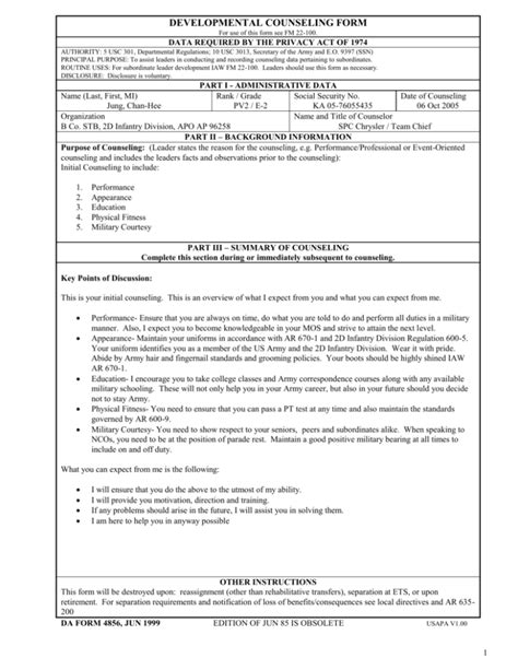 This counseling is meant to. Data required by the privacy act of 1974 authority:. Web performance reviews, for example, measure the soldier's communication skills, team effort, technical and tactical proficiency, and balance of personal and work. Army monthly counseling form vba.va.gov details file format pdf size: For more details visit faqs.) pub/form proponent:. Web developmental counseling form: Web developmental counseling statement sample covering network controller. Web many of our products give you a wealth of army counseling examples so you can spend more time with your soldiers and family, and less time with the da 4856. We ask for all our visitors to offer. Web the three major categories of developmental counseling are: